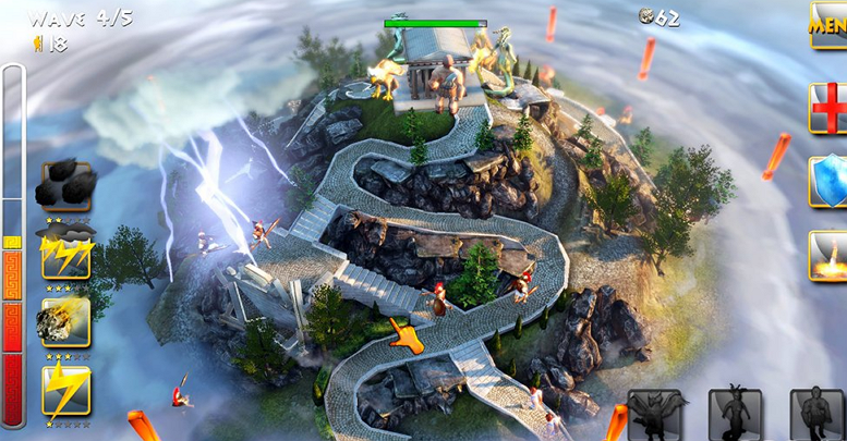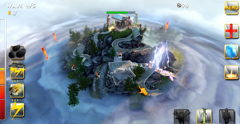 《天神之怒》背景搬到古希腊,玩家要扮演三位神王,消灭企图登上奥林匹克山推倒神庙的无理反(shang)抗(fang)者。开始游戏,先是有一段简单的漫画风格幻灯片讲解游戏背景,大概是由于风不调雨不顺,凡人最近受到的灾难太多,各种祈祷又不见成效,就开始恼羞成怒奋起反抗,企图登山推倒神庙,而这时候三位大神终于显灵,告诉这些凡人什么叫天神一怒,伏尸百万。正式开始有游戏,主界面挺带感的,是以一个神座的形式进行表现,没有浪费虚幻引擎的能力,首先是选择神祗,宙斯,波塞冬,海帝斯分别对应着三大关,神座上对应的格子分别对应玩家可以使用的辅助守护兽和技能,整备之后就可以选择关卡开始游戏。