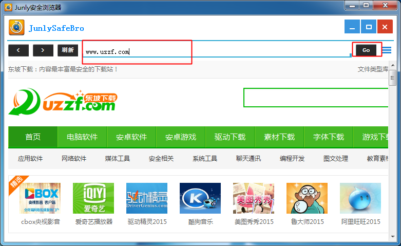 1、在地址栏输入网址,东坡小编在这里输入www.uzzf.com,点击旁边的go按钮