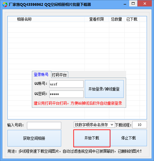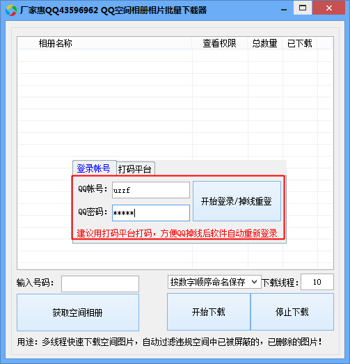 想要批量下载QQ空间相册里的照片可以使用东坡下载分享的厂家惠QQ空间批量相片下载器,厂家惠QQ空间批量相片下载器是一款可多线程超快速批量下载QQ空间相片,相册自动分文件夹保存,自动去除已删除的相片!