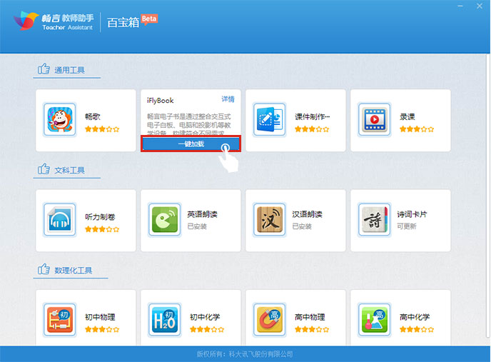 1、软件首界面点击“百宝箱”进入,挑选需要的学科应用,点击“一键加载”即可下载。