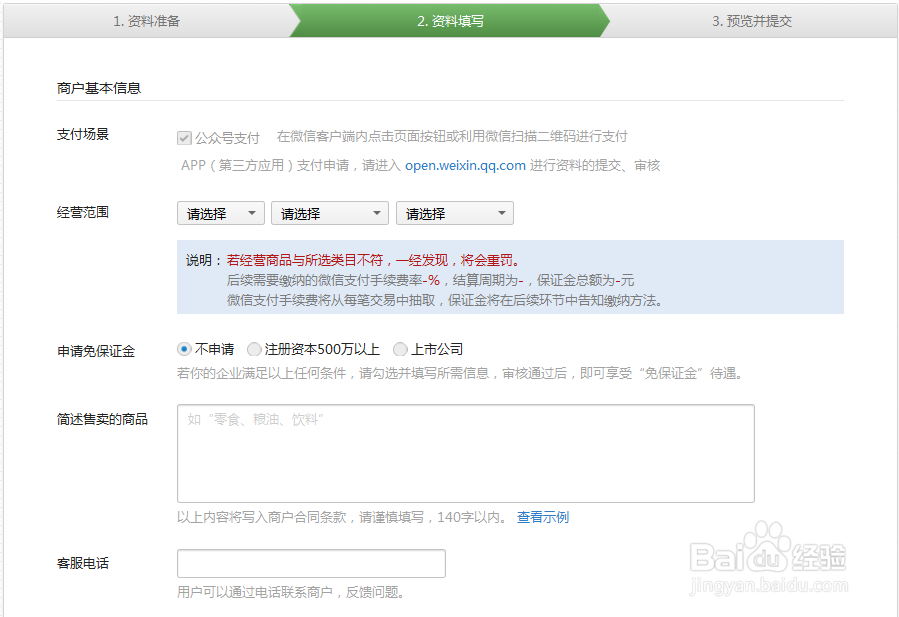 选择了经营范围后,后续需要缴纳的微信支付0.6%-2%手续费,结算周期为T+7,保证金总额为20000.00元微信支付手续费将从每笔交易中抽取,保证金将在后续环节中告知缴纳方法。