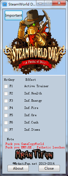 《蒸汽世界》六项修改器1.10,使用时先启动修改器,再运行游戏。