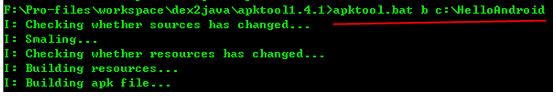 将反编译完的文件重新打包成apk,很简单,输入apktool b c:\***文件夹(你编译出来文件夹)即可,命令如下: