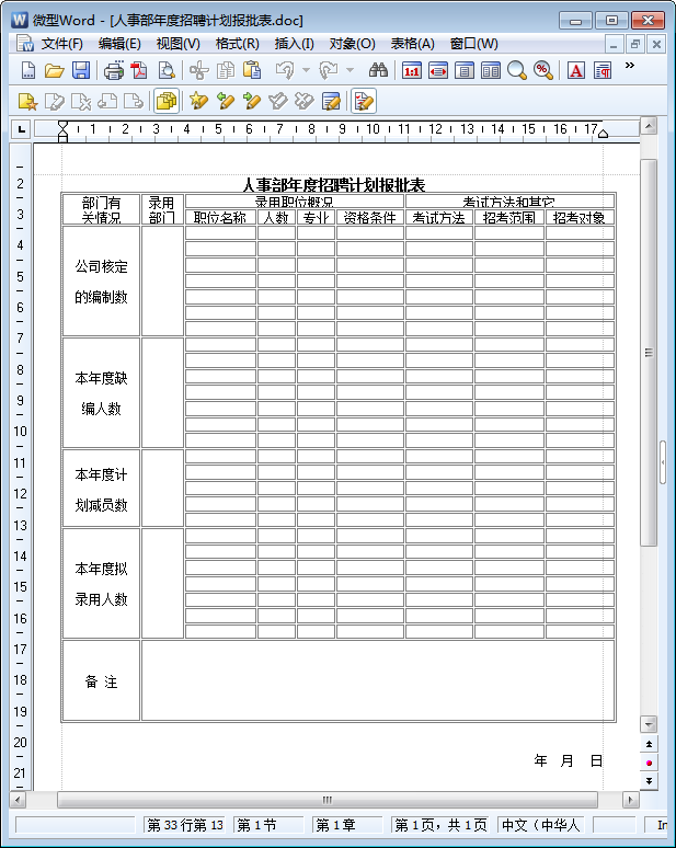 报批表是报请上级审查报告批准时使用的表格。本节内容东坡小编为大家整理带来的是一份doc格式word免费版人事部年度招聘计划报批表,如果你是一名从事人事工作的朋友,需要一份可直接进行打印使用的人员招聘计划表,那么不妨来看看这份年度招聘计划表吧!相信它会对你有所帮助和启发的,以下是关于该表格的相关介绍,希望对大家有所帮助!