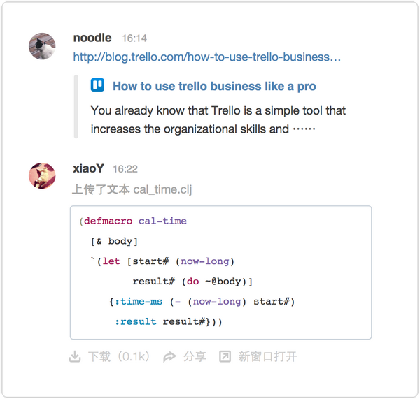 发送代码片段直接预览,全语言支持,更有语法高亮,让特殊内容获得特殊待遇。