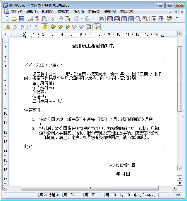 您应聘本公司 职,经复审,决定录用,请于 年 月 日(星期 )上午 时,携带下列物品文件及详填函附之表格,向本公司人事部报到。