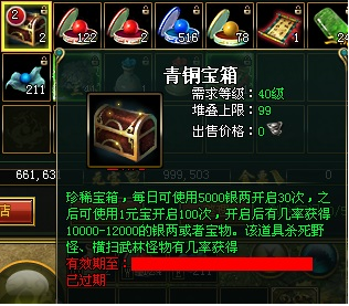 青铜宝箱是一夜暴富的一个重要途径,玩家可通过打怪获得青铜宝箱,打开宝箱需要消耗5000银两,打开之后可获得10000+的银两,还有机会获得价值10W两银子的奇珍异宝,每天限开100个,稳赚不赔的买卖,谁愿意错过!