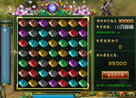 轻松小游戏,免费拿银两!桃花消消乐积分只要达3W分以上即可获得10W两银子奖励,每天最多只能获得3次奖励(VIP可额外多3次)!小游戏高手们是不是蠢蠢欲动了,该玩法就不多介绍了,直接上图。