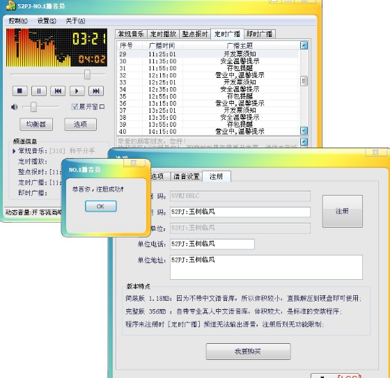 NO.1播音员,一款绿色、免费,已被技术大神破解的语音播放软件,我们经常在商场里面听到广播声,学校里的播音声、体操声......用这款软件就能重复循环的播放了。而且还有更多的功能哦!欢迎前来东坡下载使用!