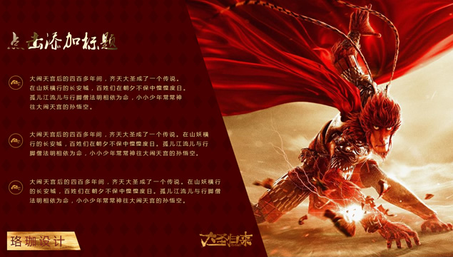 西游记之大圣归来电影感动了许多的人,每一代中国人都有属于自己的孙悟空,东坡小编在这里为大家分享西游记之大圣归来3d动画电影ppt,采用高清的大图片进行排版,ppt里字体文件已经打包,请安装之后再打开。