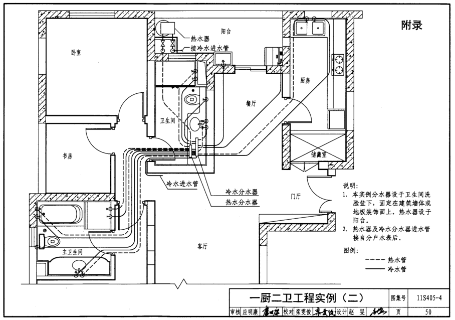 11S405-4《建筑给水塑料管道安装通用详图》主要编制了氯乙烯类、聚烯烃类、复合塑料管等给水塑料管道的管卡、支承、吊架、保温、阀门、管道穿墙、楼板及管道明(暗)装等通用节点详图;分水器及相应配件的选用与安装。