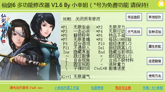 仙剑奇侠传6五十一项修改器1.6.0对应游戏中文版v1.01 -v1.02制作,新增人物等级属性修改、技能添加、游戏难度修改,一级各种添加不再需要触发,同时还增加天气代码对应气象。