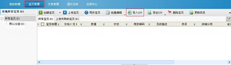 出售中或者导出仓库中导出来的宝贝使用第二步处理后,请选中宝贝,再导入处理后的csv进行覆盖