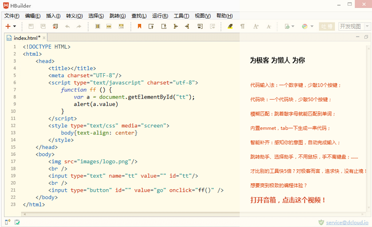 在HBuilder里预置了一个hello HBuilder的工程,用户敲这几十行代码后会发现,HBuilder比其他开发工具至少快5倍。