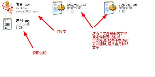 PS: 两个文件里文字的排版,请按照原来的排版方式,一行的字数不能比原来的多,多出来的不会显示如果你不想修改里面的文字,可以直接删除xuanyan.ini和biaobai.ini这两个文件,软件会自动用默认文字加载