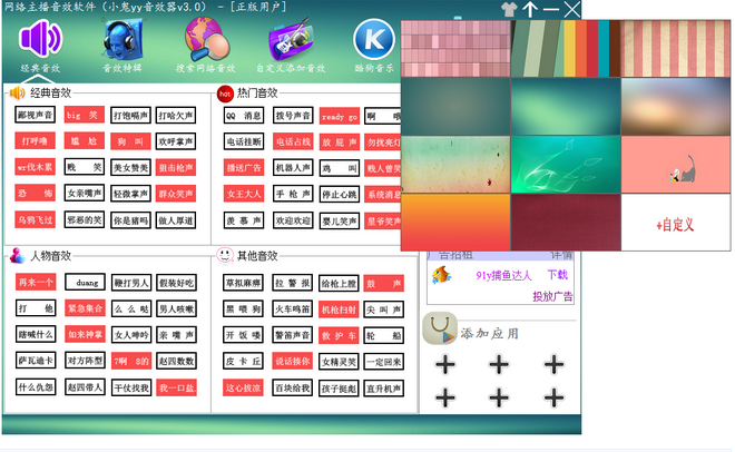 亲爱的主播,您好。您还在为直播间气氛压抑而尴尬吗?您还在为找某个音效而烦恼吗?您还在为直播时为了播放某个音效而忙手忙脚吗?您还在为您的直播间人气少而担心吗?您还在为那些所谓很厉害的音效软件收费而气愤吗?好,今天给您带来一款音效上的神器“小鬼yy音效器3.0版本”不是仅用于yy直播。这是一款原创音效最多、颜值最高、功能最强悍的音效软件。个性主流的UI设计特别养眼。软件内置了528个音效包括各类动物音效、天气音效、小品搞笑音效等。当然如果您嫌音效不够多,你也可以将自己电脑上的音效添加到软件上来,本软件还提供了4个搜索接口,第一个是音效搜索接口。第二个是5sing伴奏搜索接口,第三个是QQ音乐正版音乐搜索接口。一站式将音效做到丰富!在这个软件上的每一个音效都可以设置一个播放热键(ctrl+任意键),当我们需要播放这个音效的时候只需要按下之前设置好的热键即可播放。神奇之处还是声控音效啦。我们设置一个语句,说出对应的语音即可播放音效。将您的直播间名称,地址在软件上发给作者就可以把你的直播间挂在这个软件上,用户一点即可进入您的房间增加人气。说到这一般人肯定会说要收费的吧,本软件完全免费使用。关注软件公众号,或加入软件作者群索要注册码即可无上限使用!