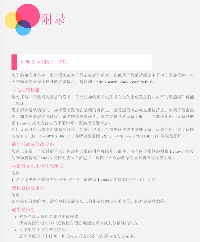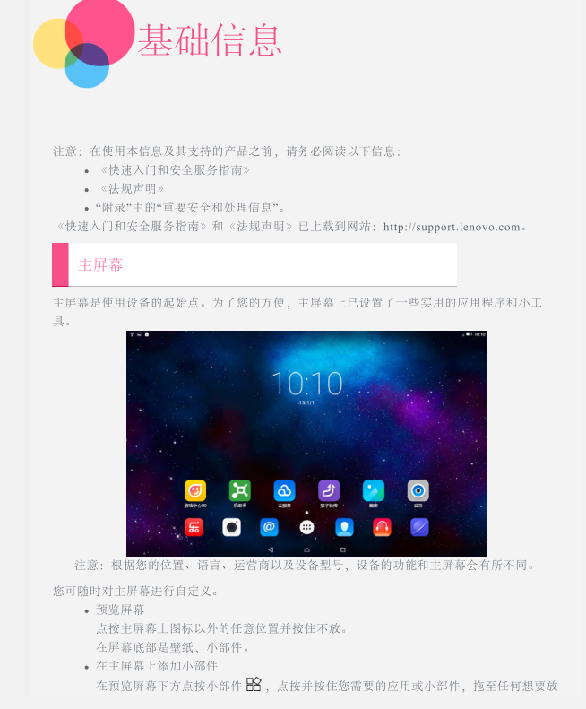 本节内容东坡小编为大家整理带来的是联想平板电脑说明书之Lenovo TAB 2 A10-70用户指南,该说明书详细介绍了联想平板电脑tab 2 a10-70的操作方法以及使用注意事项等,比如对主屏幕以及屏幕按钮、通知面板和快捷开关的功能介绍、比如对拍摄照片和视频的方法的介绍等,如果你想对联想的这款平板电脑有更多的了解,那么不妨来看看这份pdf格式高清彩版Lenovo TAB 2 A10-70用户指南吧!