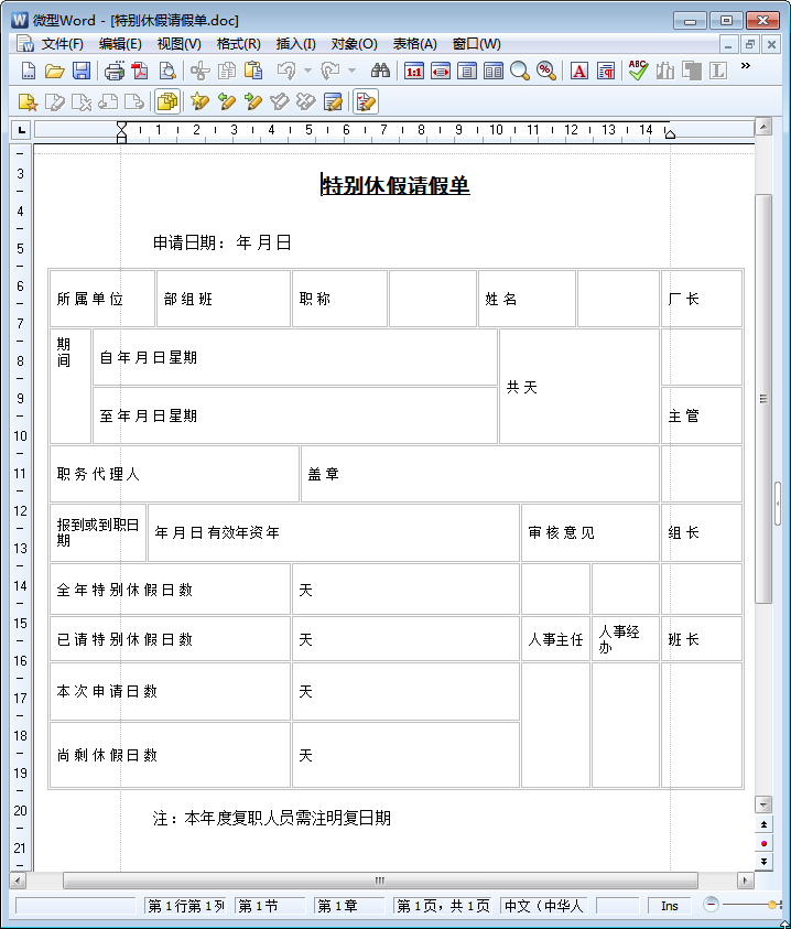本节内容东坡小编为大家整理带来的是doc格式word版员工请假单模板之特别休假请假单,该特别休假请假单表格栏目完善,条理清楚,以下有关于该表格模板的图样,如果你需要这份特别休假请假单模板作为参考的话,点击本文相应的下载地址进行下载即可!