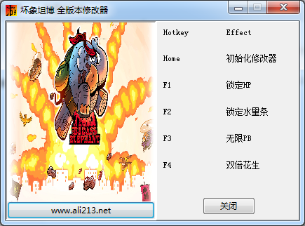 坏象坦博全版本四项修改器,游戏全版本通用,提供无限血、无限水量、无限PB、双倍花生四项功能,让你在游戏里给你提供更加轻松的环境。