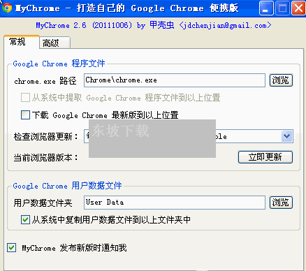 自动检测最新版本谷歌chrome浏览器并下载更新为绿色便携版本的小工具。Google Chrome 原版自动更新依赖于 google update,强制更新无法选择,若是用一般的便携版就不能自动更新,每次出新版都要手动下载、安装,很麻烦。但是用 MyChrome 这个引导器,即使是便携版也可设置为自动更新,而且可以选择分支,目前支持 Satble、Beta、Dev、Canary、Chromium 等分支的自动更新。当然也可以选择不更新,不像原版那样强制更新。