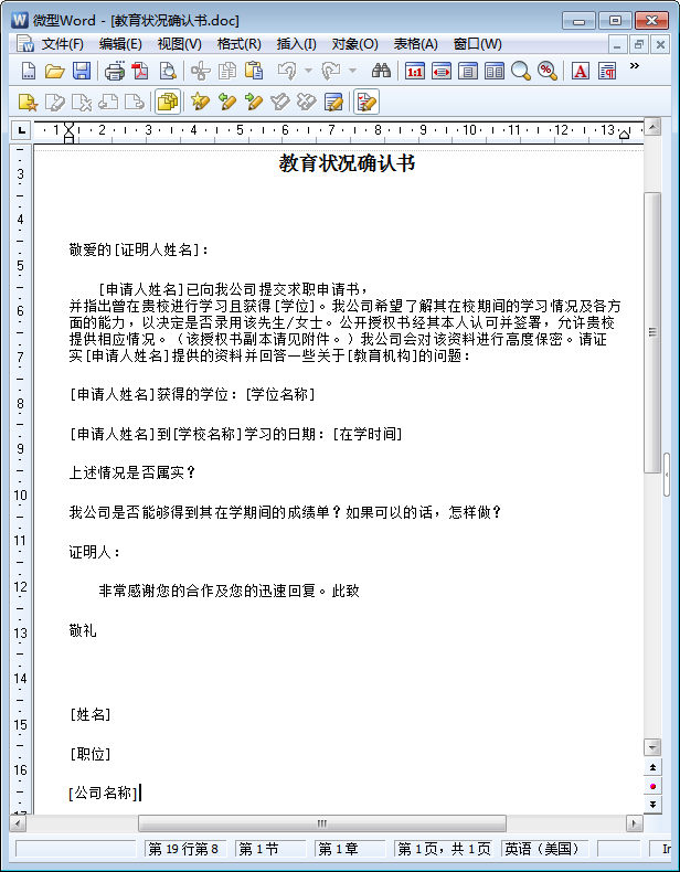 [申请人姓名]已向我公司提交求职申请书,并指出曾在贵校进行学习且获得[学位]。我公司希望了解其在校期间的学习情况及各方面的能力,以决定是否录用该先生/女士。公开授权书经其本人认可并签署,允许贵校提供相应情况。(该授权书副本请见附件。)我公司会对该资料进行高度保密。请证实[申请人姓名]提供的资料并回答一些关于[教育机构]的问题: