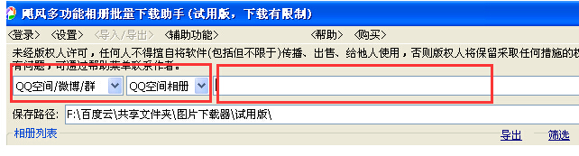 1、解压后打开软件,如下图,在左侧红线框中选择你要下载的相册类型,在右侧红线框中输入你要下载的那个人的主页网址或者相册网址(如果是下载QQ空间的相册,直接输入QQ号)