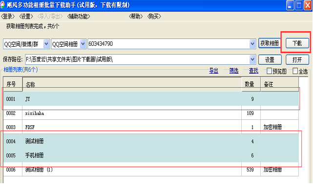 4、读取出相册列表后,选择你要下载的相册(选中时,背景为淡蓝色),然后点下载按钮(相册可单选,多选,下载按钮下边有全选按钮)