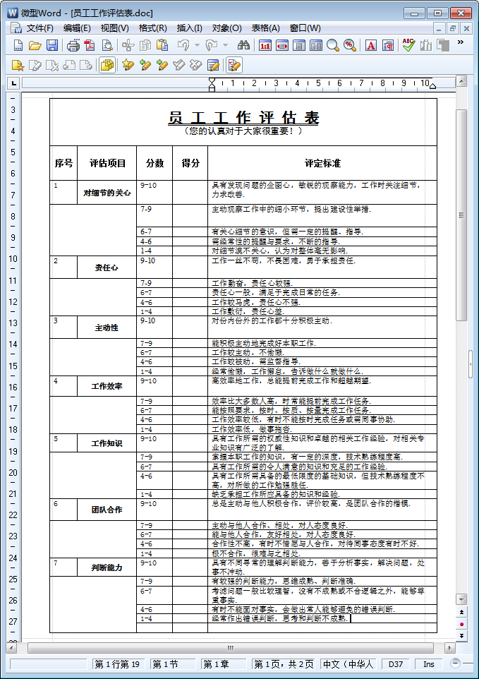 员工工作评估表是在对员工工作表现作评价时会用到的一种表格。该表格一般包含有评估项目、评定标准等——那么评估项目中到底都有哪些“项目”呢?评定标准又是什么标准呢?本节内容东坡小编为大家整理带来的是一份word免费版员工工作评估表参考模板,以下有该表格模板的图样,需要下载的朋友点击本文相应的下载地址进行下载即可!