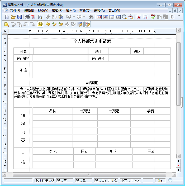 我个人希望参加上项机构所举办的培训,培训课程细目如下,所需经费希望由公司负担,此项培训必能增加我未来的工作效率,其中课程训练时间,如有任何改变,我必依照公司规则通知有关部门。时间个人如触犯任何公司规则,愿意由公司扣除本人薪水以抵缴公司代付的学费。