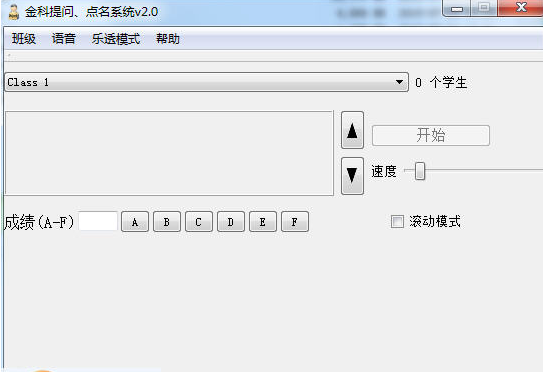 在班级和学生信息设置完成后,老师就可以进行随机点名、提问并完成打分。由于一个老师可能教授多个班级,或者多个老师同时使用一台电脑教授不同班级,所以在软件启动后,老师需要切换到当前授课的班级,老师可以通过主窗口中下拉框控件切换到当前班级。此时,可以点击“开始”按钮随机点名,软件在不断的刷新当前学生学号,这类似于电视抽奖,点击“停止”按钮后,当前学号的学生就被选中,老师可以根据学生是否出勤、课堂提问回答是否正确、电子作业是否提交以及正确与否进行’A’到’F’的等级评分,评分采用密码文本方式隐藏,需要按回车键加成绩存入到数据库。老师可以多次点击“开始”和“停止”按钮随机抽取若干个学生进行点名。在班级学期末时,老师可以利用本软件自动对上课点名和提问的所有学生成绩进行平均成绩计分。