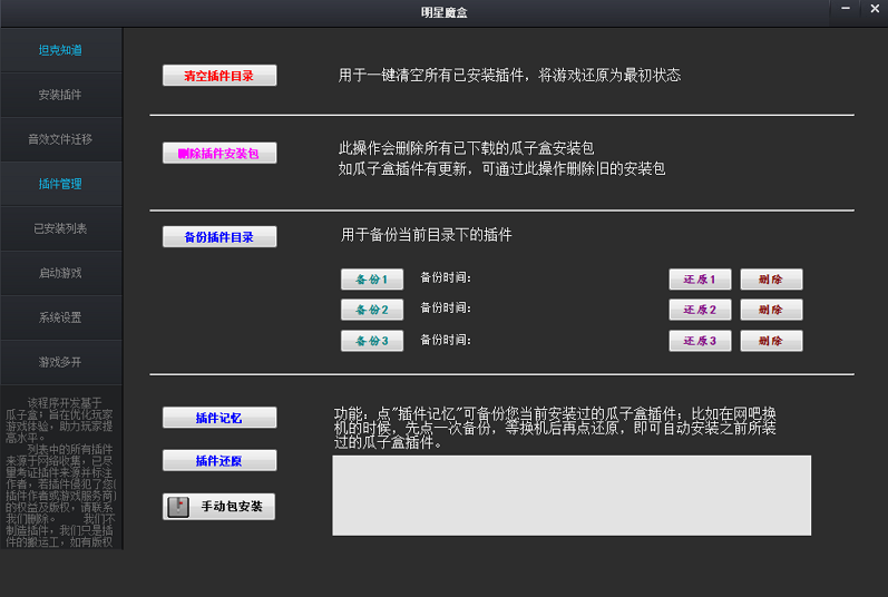 坦克世界明星魔盒是一款功能十分强大的游戏辅助工具。坦克世界明星魔盒能为大家提供各种实用的游戏辅助功能,例如:游戏插件、游戏多开、插件管理、音效文件转移等,有需要的赶紧来东坡下载吧。