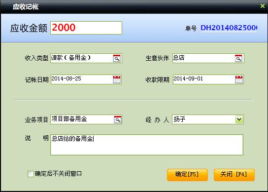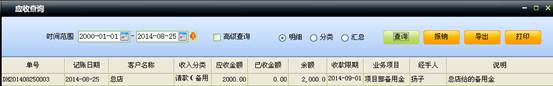 3.应收记账、应收查询:用户可以将应该收入的项目计入帐内,后期可以通过应收查询查到此笔应收账款的详细信息和收款期限,也可以对此笔应收帐修改、作废和销账。