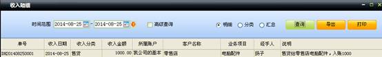 1.收入记账、收入查询:用户对于入账的项目进行登记,后期可以通过收入查询可以查询到这笔收入,支持明细、分类、汇总三种方式进行呈现此笔收入,也可以对此笔收入进行修改和作废。