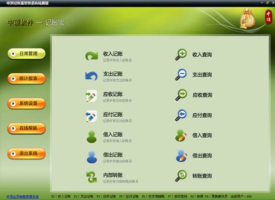 中顶记账宝管理软件从企业的特征和实际需求出发:提供收支记账、借入借出记账、应收应付记账、转入转出记账以及各类账务报表统计等功能,可以自主设置账户、客户、员工及收支分类、业务项目、币种设置等智能化管理,为管理者的财务提供专业、准确、安全的管理策略。系统界面简洁优美,操作直观简单。