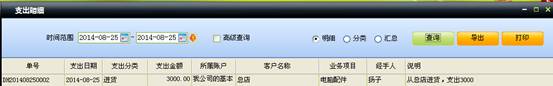 2.支出记账、支出查询:用户对于支出的项目进行登记,可以通过支出查询进行按明细、分类、汇总三种方式呈现出此笔支出,也可对这笔支出修改和作废。