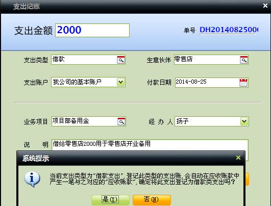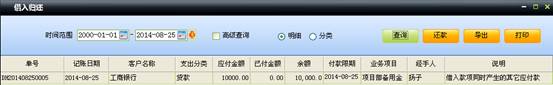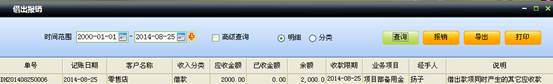 6.借出记账、借出查询:本公司借给他人的账款进行登记,可以通过借出查询查到该笔借出账款的详细信息及收款期限,可以对此笔借出账单修改、作废和销账。