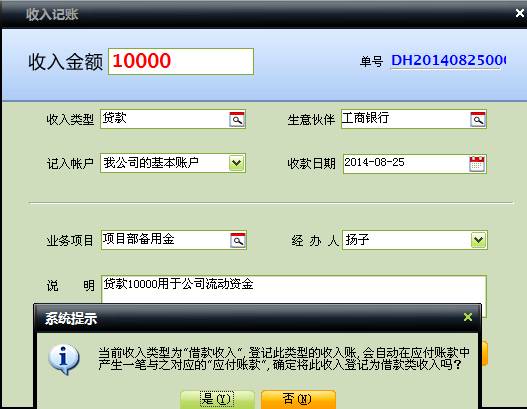 5.借入记账、借入查询:对于本公司借的他人的账款进行登记,可以通过借入查询可以查到此笔借入的账款详细信息和还款期限,可以对此笔借入账单修改、作废和销账。