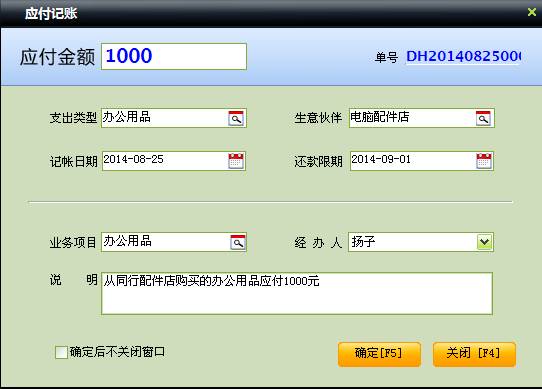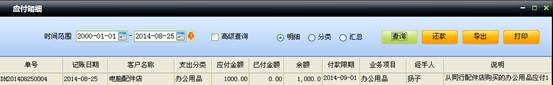 4.应付记账、应付查询:用户可以将应该支付的项目登记,后期可以通过应付查询查到此笔应付账款详细信息和付款期限,可以对此笔应付账款修改、作废和销账。