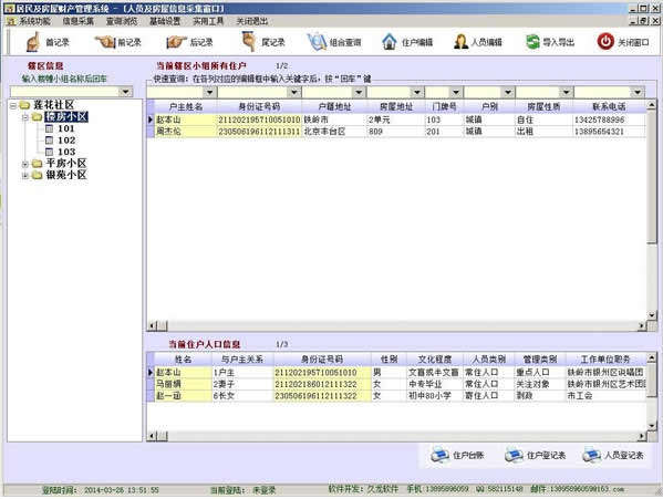 2 居民信息管理:对辖区住户、人员信息的管理,以不同的方式浏览辖区的住户及居民信息,可以按辖区>小区>楼幢>住户>人员的级联方式(以防找人)查询,也可以按人员>住户>辖区的方式(以人找房)查询。信息录入完毕后,自动生成“居民信息登记表”。