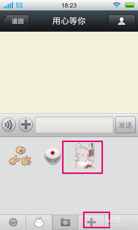 使用添加的自定义表情可以再与好友聊天的时候点击“+”,然后点击“表情”按钮