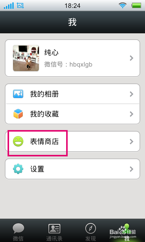 点击“我”按钮以后,进入到我的设置窗口,点击窗口下面的“表情商店”
