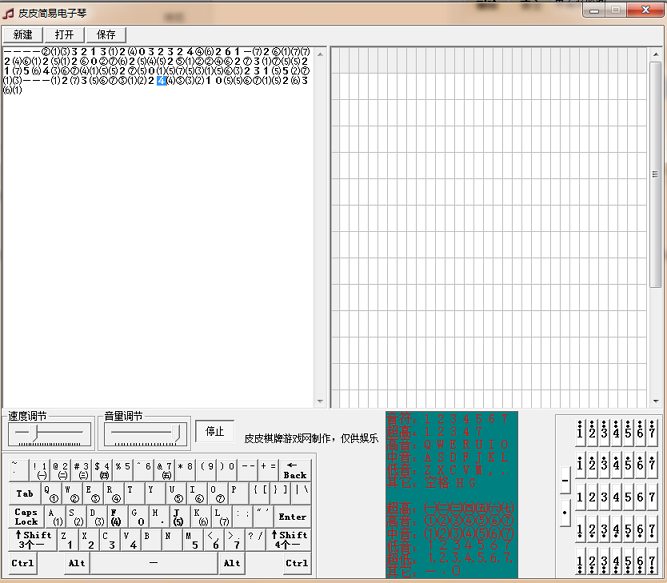 打开之后,可以选择新建或者打开一份音乐简谱,编辑好之后可以试听。乐谱以简谱标注,简谱上标注是4/4拍的,一拍长度为8个字,所以4拍就有32个字,乐谱文本一行有32个字。半拍就是4个字,1/4拍就是2个字,1/8拍就是1个字。