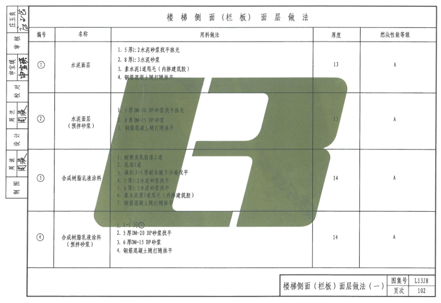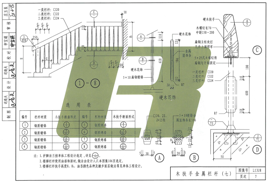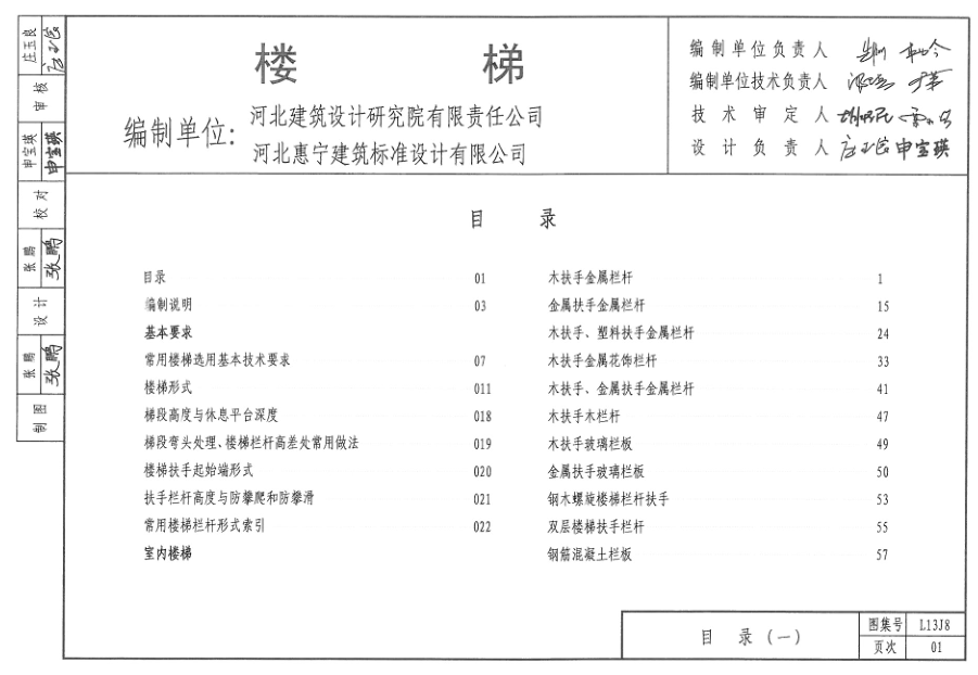 L13J8楼梯图集内容包括室内楼梯、室外楼梯、辅助楼梯和屋顶上人爬梯。内容以一般民用建筑为主,同时也编入了一些中、高级民用建筑装修标准所需内容如木栏杆、金属花饰栏杆、玻璃栏板等。