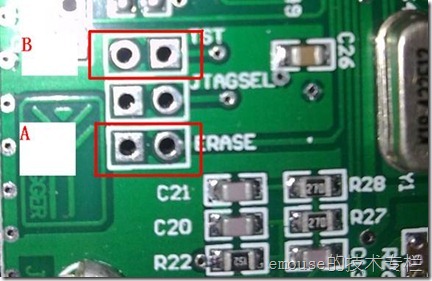短接图中A的两个过孔约5秒。断开A位置的两个过孔的短接。然后拔掉JLINK与P C间的USB线(注意先后顺序)。