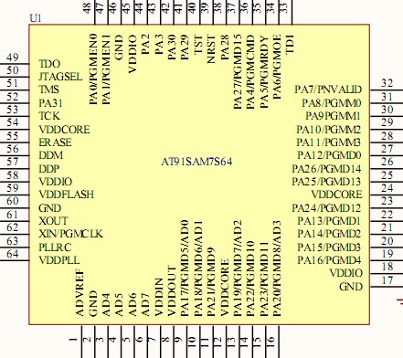 3、当然如果你的PCB版跟我的不一样,我也给出了解决方案,即根据芯片AT91SAM7S64的引脚排列找到其Erase脚和TST脚,AT91SAM7S64管脚排列如下图所示: