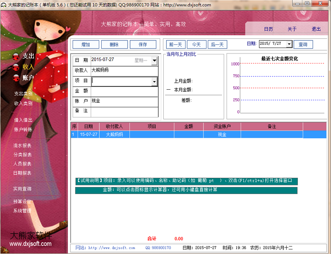 大熊家的记账本可以自已定义界面,支出记录、收入记录、支出分类、收入分类、分类报表、日期报表、人员报表、流水报表预算管理和管理注册、日历功能,有需要的赶紧来东坡下载吧。