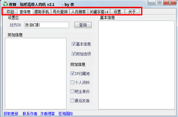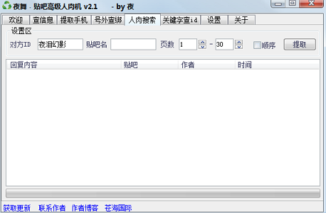 夜舞贴吧高级人肉机(贴吧搜索软件)是一款功能强大的贴吧人肉搜索器,可以帮助你快速搜索贴吧用户的资料等信息,有需要的赶紧来东坡下载吧。