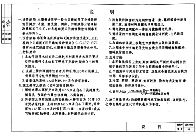 L96J003卫生间配件及洗池图集本适用于一般公用建筑及工业辅助建筑的厕所、盥洗室、浴室、厨房,并兼顾部分较高标准建筑的卫生间。对有特殊要求的建筑构造详图本图集未于列入。该图集一般被简称为l96j003图集,为山东省建筑标准图集之一。本节内容东坡小编为大家整理带来的是一份pdf格式扫描由74页组成的l96j003图集,图集内容完整、字迹清晰,如果你需要这份图集的话,点击本文相应的下载地址进行下载即可!