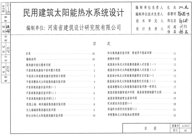 L13j13民用建筑太阳能热水系统设计图集为山东省13系列建筑标准设计图集之一。该图集一般被简称为l13j13图集。点击本文相应的下载地址你将会获得东坡小编为你整理带来的这份pdf格式清晰版由56页组成的l13j13图集,如果你需要这份山东省13系列建筑标准设计图集的话,那就快来下载吧!