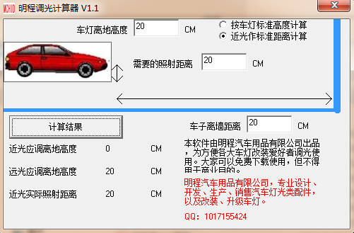 设置车灯离去高度,按车灯标准高度计算,按近光作标准距离计算,车子离墙距离,计算出近灯应调离高度,远光应调离高度,近光实际照射距离。